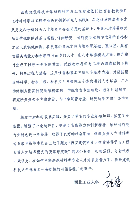 该成果分别在2008年,2010年,2013年教育部无机非金属材料教学指导委员会会议上做大会经验交流和推广,反响强烈,得到材料类教育专家的好评和社会的认可。