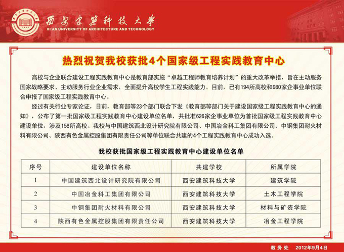 2012年我院材料科学与工程专业与中钢集团耐火材料公司联合成功申报了国家级工程实践教育中心。 与广东蒙娜丽莎新型材料有限公司合作,在建筑陶瓷行业成立国内第一个院士工作站。以院士工作站为支撑,蒙娜丽莎新型材料有限公司已经成为国家资源循环型、环境友好型企业,获准设立了博士后科研工作站,获批国家级企业工程技术中心,其开发研究的超大超薄陶瓷板获评建国六十周年建材行业六大科技成果之一,其水平处于国际领先地位,超大超薄陶瓷板与计算机喷绘技术相结合用于建筑幕墙,正在替代玻璃幕墙。
